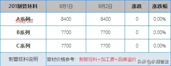 201方面,青山代理报8-9月资源:鼎信J2-7700元/吨;J3-8000元/吨;J1-8400元/吨;J4-9000元/吨。其他产地资源代理报价依旧维稳,但贸易商报价多见低于代理价格50元/吨以内进行销售,广西窄带含税偏向靠拢7650元/吨。个别中频料低价在7600元/吨附近,并且有送货政策。大板方面,鼎信资源有向弱迹象,贸易商报J2料含税7680元/吨基。另外,宝钢T4料低位在含税7600元/吨等待成交。